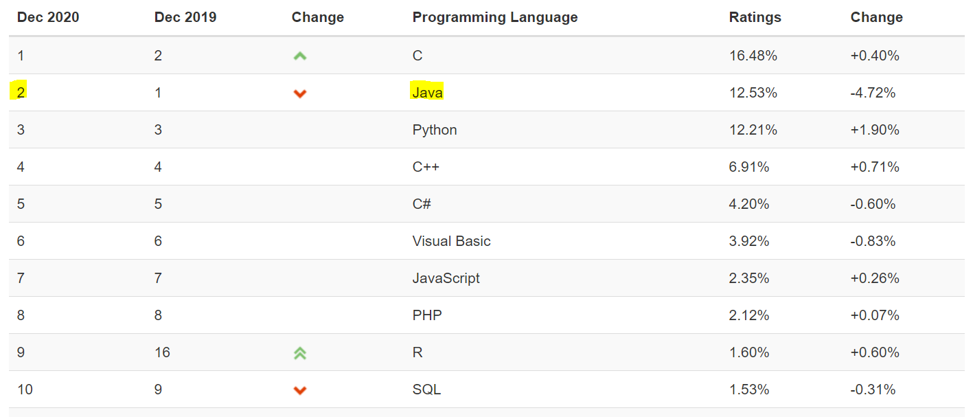 2020/12 기준, Tiobe 티오베 프로그래밍 언어 순위에서 Java는 2위를 차지하고 있을 만큼 많은 개발자들이 사용하는 언어이다.