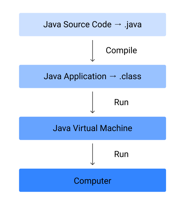 그러나, Java 컴파일러는 특정한 컴퓨터를 위한 코드를 바로 생성하지 않고 대신에 가상적인 기계(JVM)를 위한 코드(바이트코드 Byte code)를 생성한다. 그 이후 "Java Virtual Machine" 자바 가상 머신이 컴파일된 코드를 실행한다. 이렇게 두 단계로 나눠서 컴파일하고 실행하는 이유는 응용프로그램들을 다시 컴파일하지 않아도 모든 컴퓨터에서 실행되도록 하기 위해서이다.