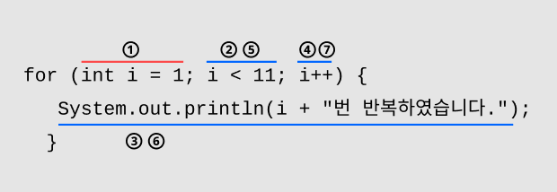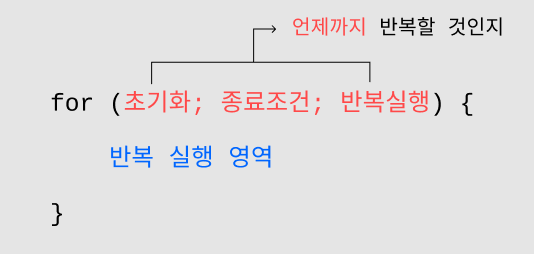 for 문의 경우에는 for 다음의 소괄호 ( ) 안에 세미콜론 ; 으로 구분하여 다음과 같이 한번에 작성한다.